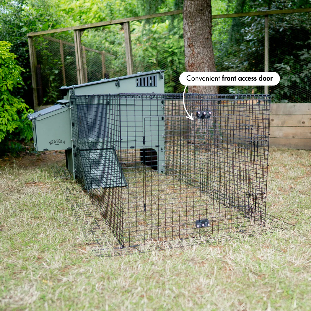 - Toegangsdeur aan de voorkant: Hiermee kunt u gemakkelijk uw kippen verzorgen, voer bijvullen en de ren schoonmaken zonder gedoe.